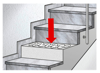 - Inserire le strisce adesive nel giunto di dilatazione tra il componente e la superficie in senso longitudinale o trasversale a una distanza di 8-10 cm. Per esempio, per i componenti quali gradini, davanzali, soglie, usare 2 pesi da 15 kg per distanziale.