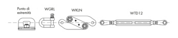 Collegare il riduttore di tensione WKLN da un lato al golfare dell’altro punto di ancoraggio di estremità mediante il grillo WGRL già integrato al riduttore stesso, e dall’altro lato al tenditore WTD12, precedentemente lubrificato. Nei punti di ancoraggio da lamiera grecata WCLM25 e WCLM25R il riduttore di tensione è già integrato sui punti di ancoraggio stessi, dunque il tenditore WTD12 andrà agganciato direttamente al golfare del punto di ancoraggio di